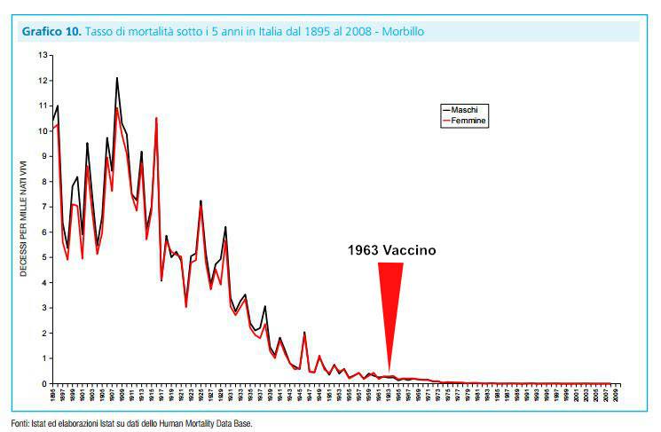 Esiste per fortuna un interessante rapporto dell’Unicef che riporta i dati Istat dal 1895 al 2008 della mortalità per morbillo tra bambini maschi e femmine sotto i 5 anni.